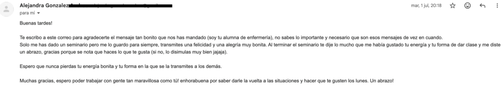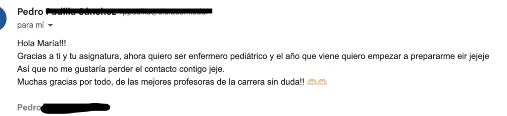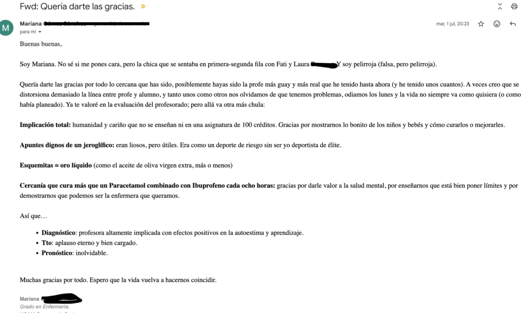 Intento parecerme lo menos posible a las profesoras que menos me gustaron (las que me enterraban en diapositivas, hacían seminarios prácticos en los que no se practicaba nada, me leían Powerpoints en voz alta ignorando que sé leer en mi casa) y parecerme más a las que sí me gustaron (las que me hacían pensar, los que daban un esquema de los puntos clave, las que me dejaban bien clarito qué tenía que aprender para ser enfermera y por qué, y las que provocaban que tuviera ganas de estudiar porque en clase me habían transmitido curiosidad y ganas de vivir).